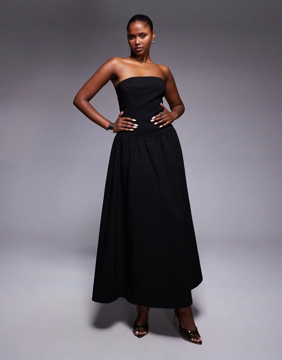 The Kaiia Exclusive Bandeau Drop Waist Gathered Skirt Maxi Dress in Black is ideal for evening, party, formal.