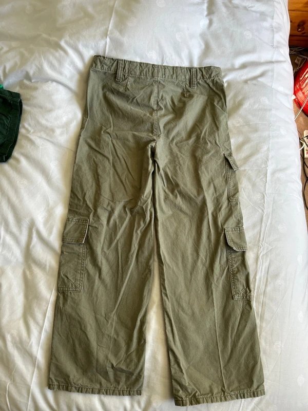 Designed with khaki, thick cotton twill fabric, these cargo pants feature a drawstring waist and a press stud and zip front. They include two front pockets, two patch pockets on the right leg, and one patch pocket on the left leg.