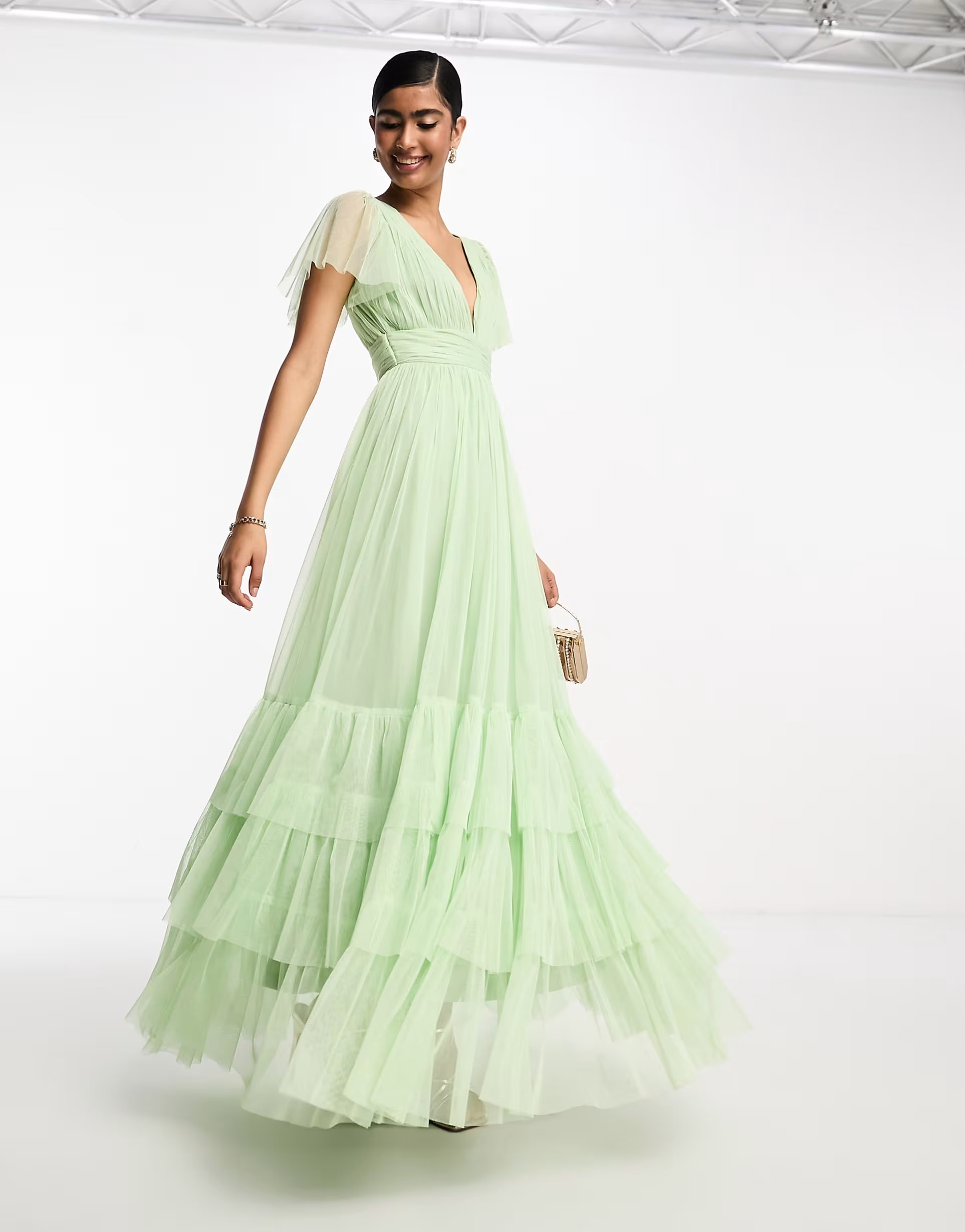The ASOS Lace & Beads Bridesmaid V-Neck Tulle Maxi in Sage is ideal for party, date-night, wedding-guest.