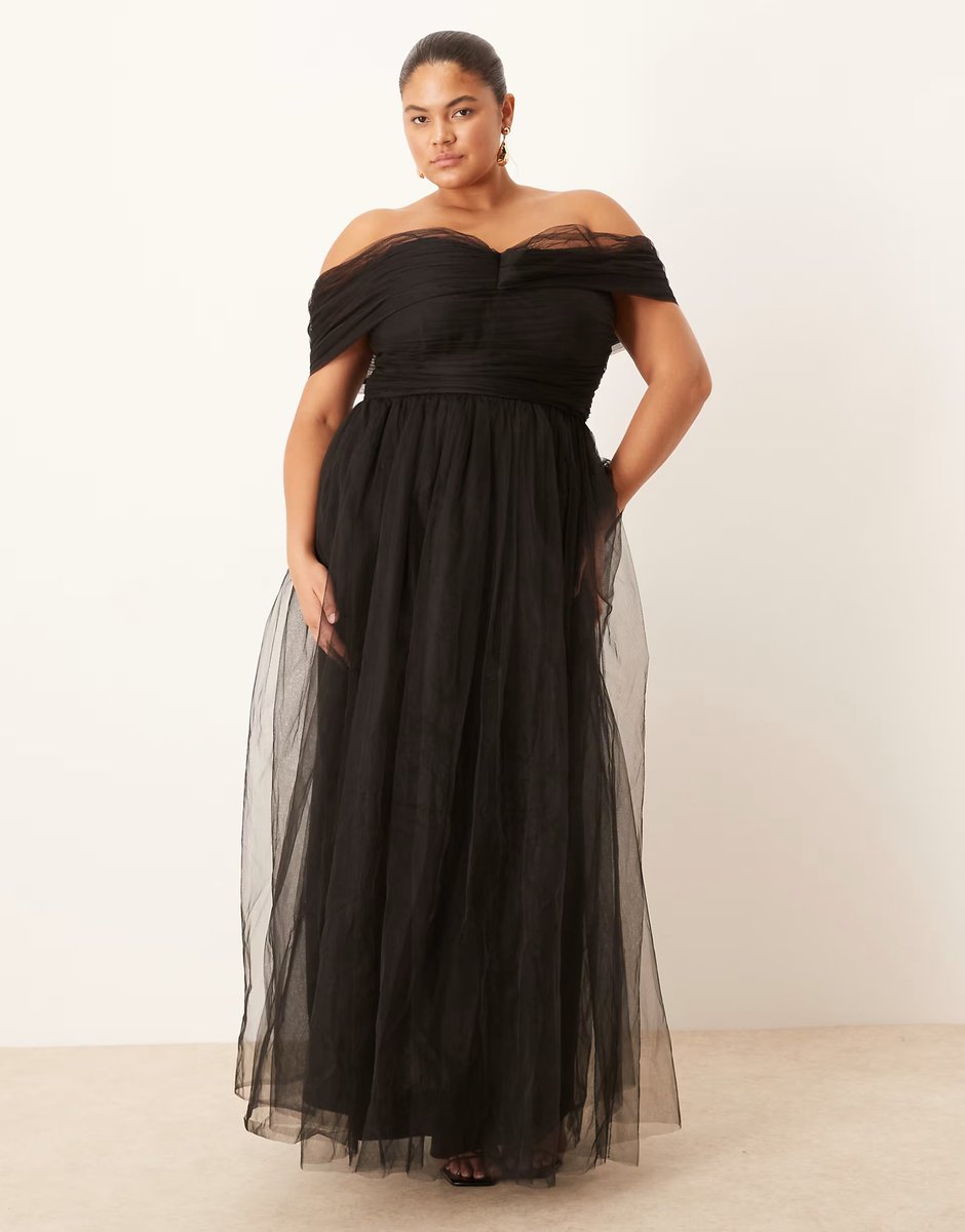 The ASOS Lace & Beads Plus Bow Off-Shoulder Maxi Tulle Dress in Black is available in sizes XXXL, XXL, XL, XS, L, M, S.