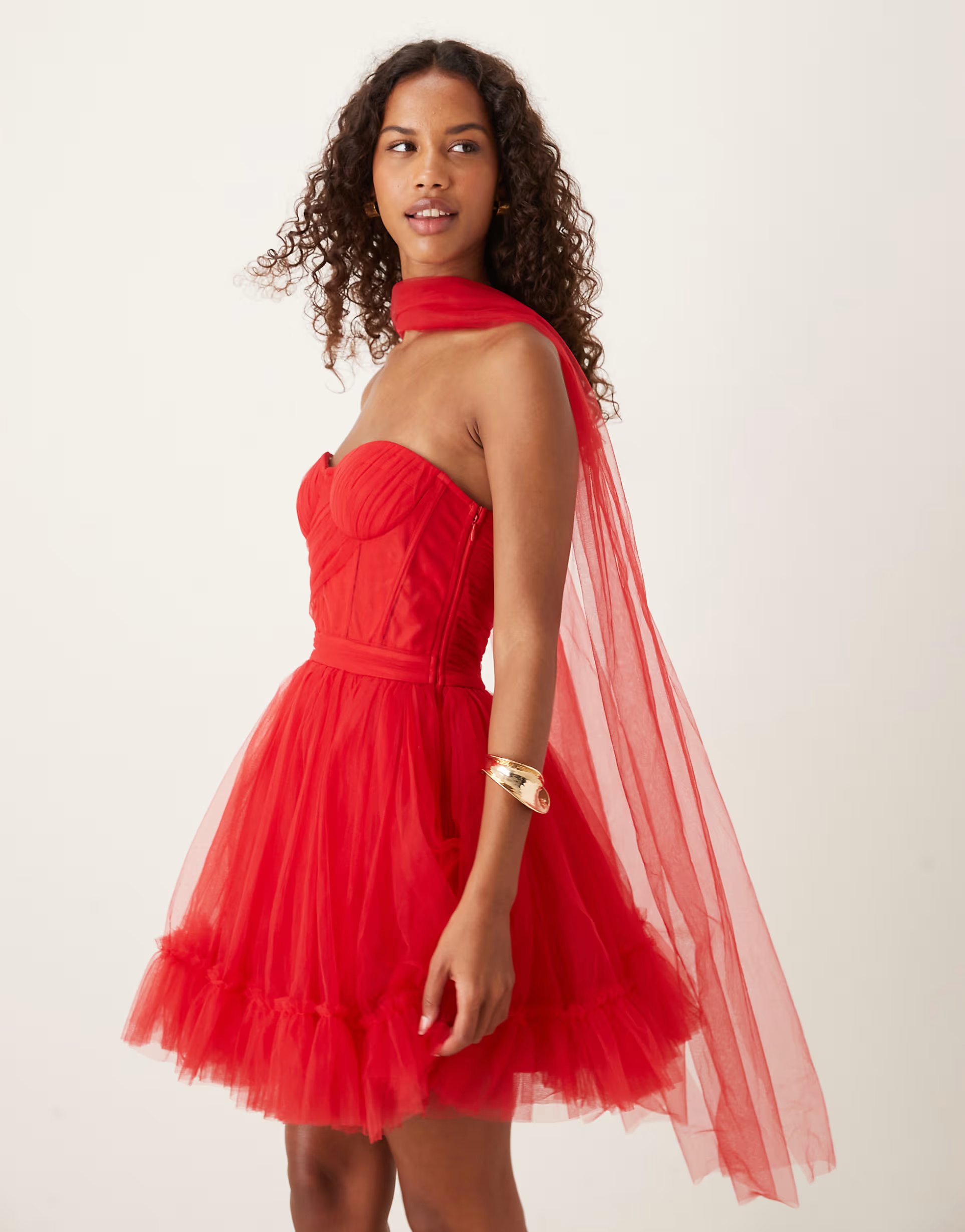 The ASOS Scarf Neck Corset Mini Dress in Red is made from tulle.