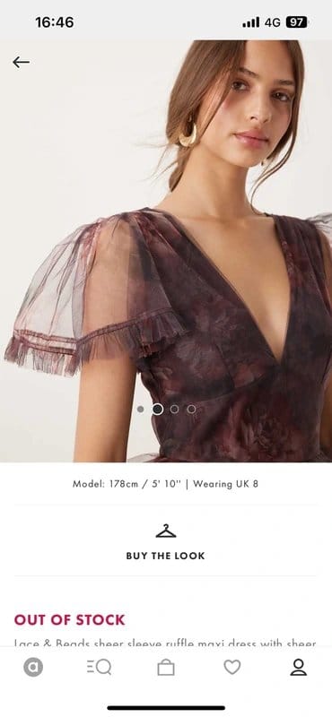 This ASOS maxi dress features a tie-dye pattern in brown and purple hues. The sheer ruffled sleeves and V-neckline add an elegant touch. Made from tulle and printed fabric, it's perfect for special occasions.
