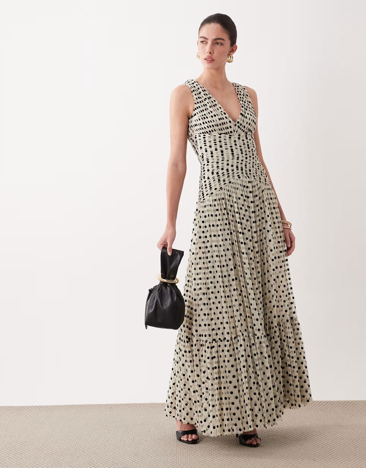 See all outfit ideasThis cream spot lace & beads V-neck maxi dress features a ruched waist and maxi length. Ideal for evening events or special occasions.