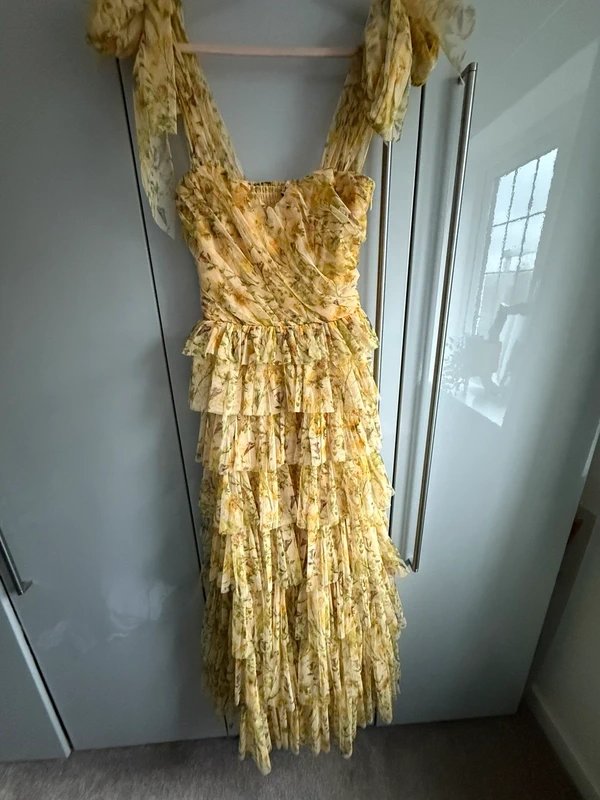 Yellow Floral Print Wedding Guest Dress — the must-have occasion dress for wedding guests. Designed in vibrant yellow with a floral print, this long dress features self-tie bows on the shoulders and a zipper on the side. Crafted from lightweight tulle with tiered layers, it adds a touch of elegance to any special event. Includes a full-length jersey slip lining for comfort and coverage.