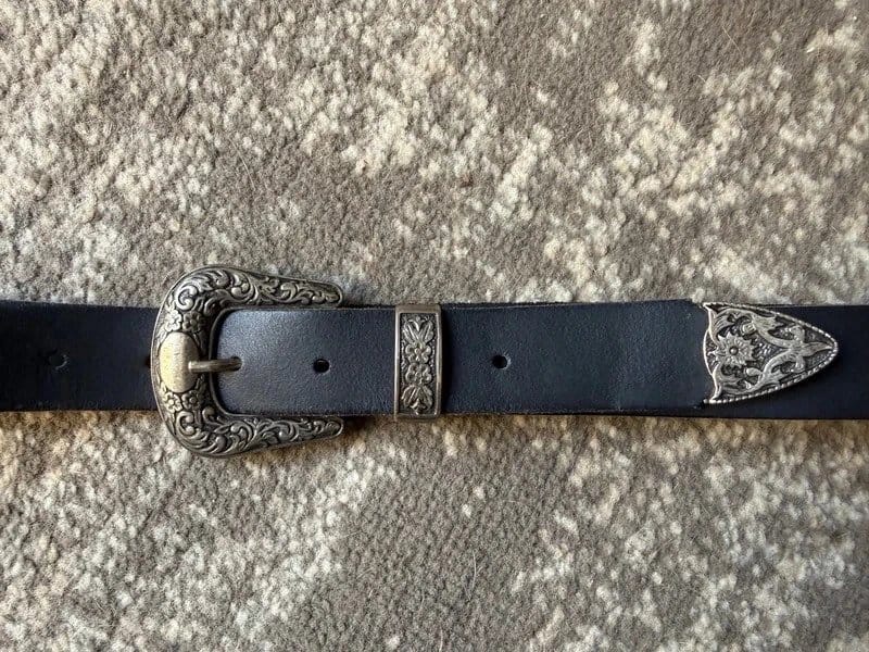 Stylish western-style belt from ASOS in black leather. Features a metal-tipped belt end and detailed buckle for a touch of elegance. Perfect for adding a western flair to any outfit.
