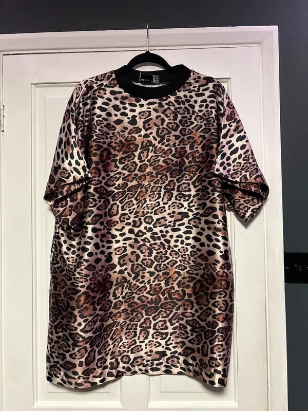 The ASOS Brown Leopard Print T-Shirt Dress is available in sizes M.