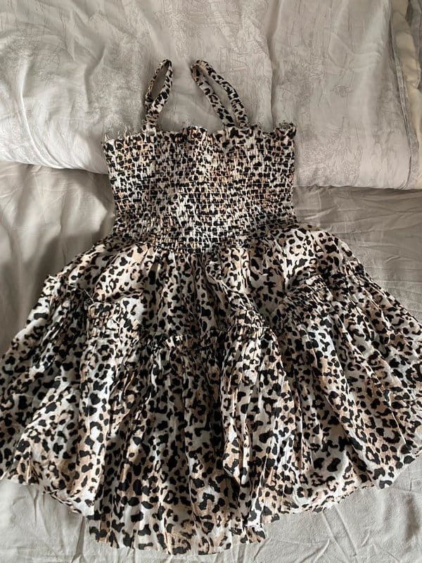 This leopard print skater mini dress features a cute open-back design and an elasticated top with a puffy skirt. Perfect for casual outings or evening events.