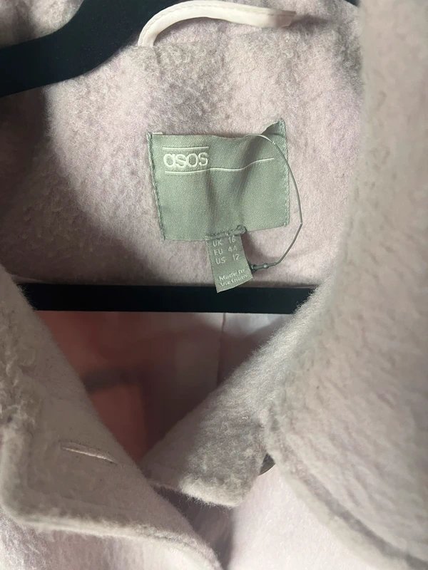 Light pink wool coat from ASOS. Designed for a flattering fit, this thick coat features a classic silhouette with a tie strap for adjustable fit. Crafted from soft wool, it offers warmth and comfort for cooler days. Perfect for layering over your favorite outfits.