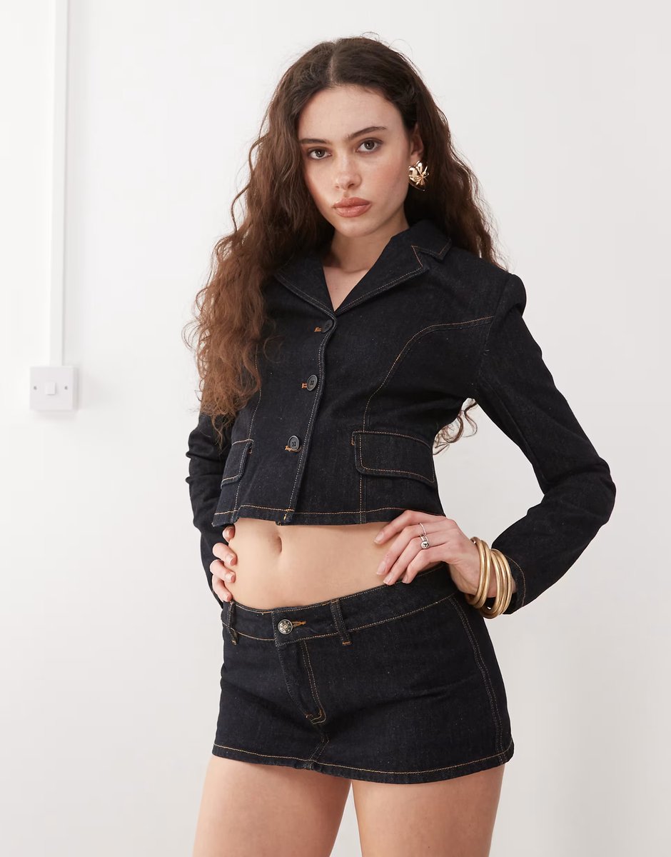 The ASOS Lioness Contrast Stitch Jacket Co-ord in Dark Wash Denim is ideal for casual, smart-casual.