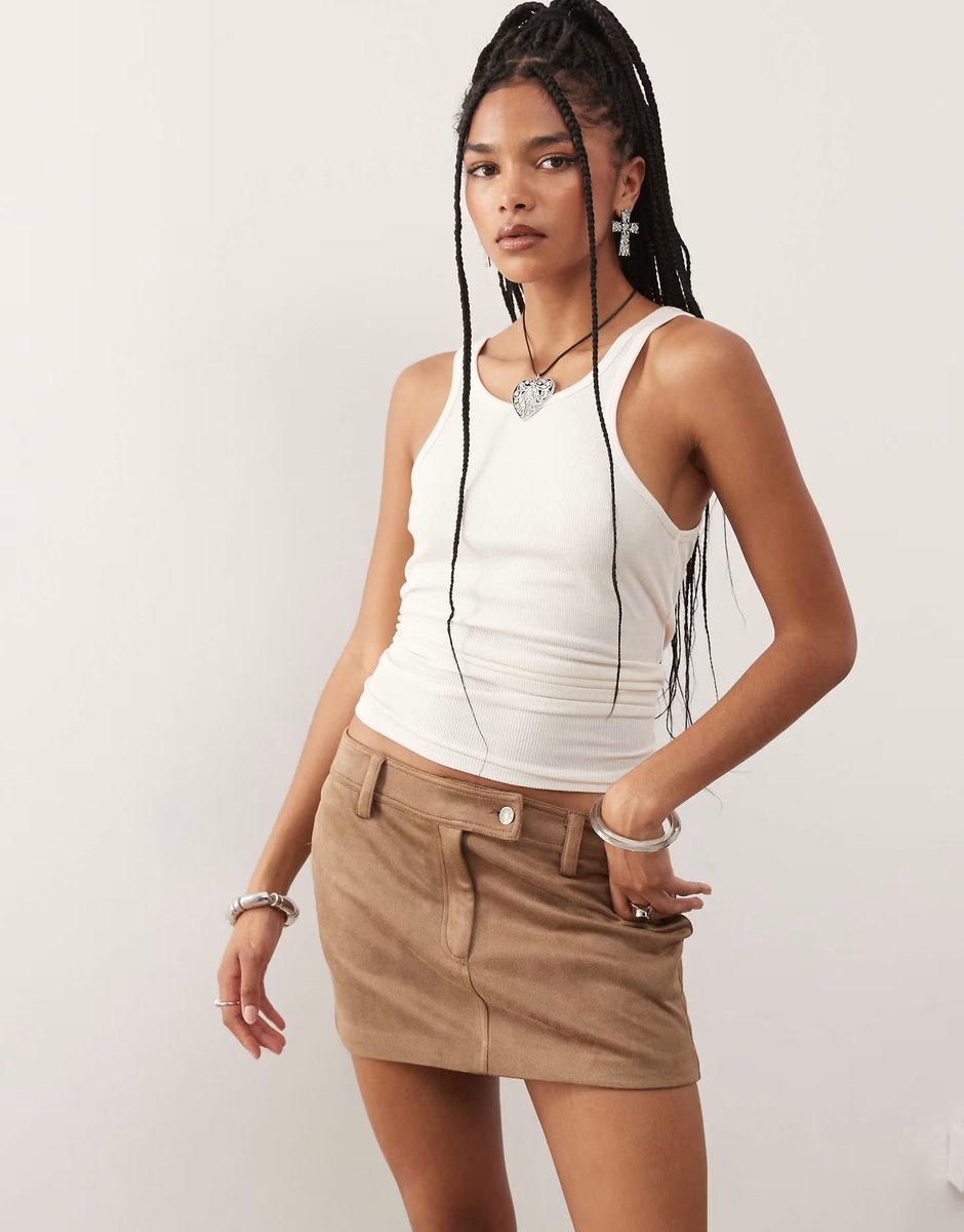 The ASOS Mirage Faux Suede Low Rise Mini Skirt in Camel is ideal for casual.