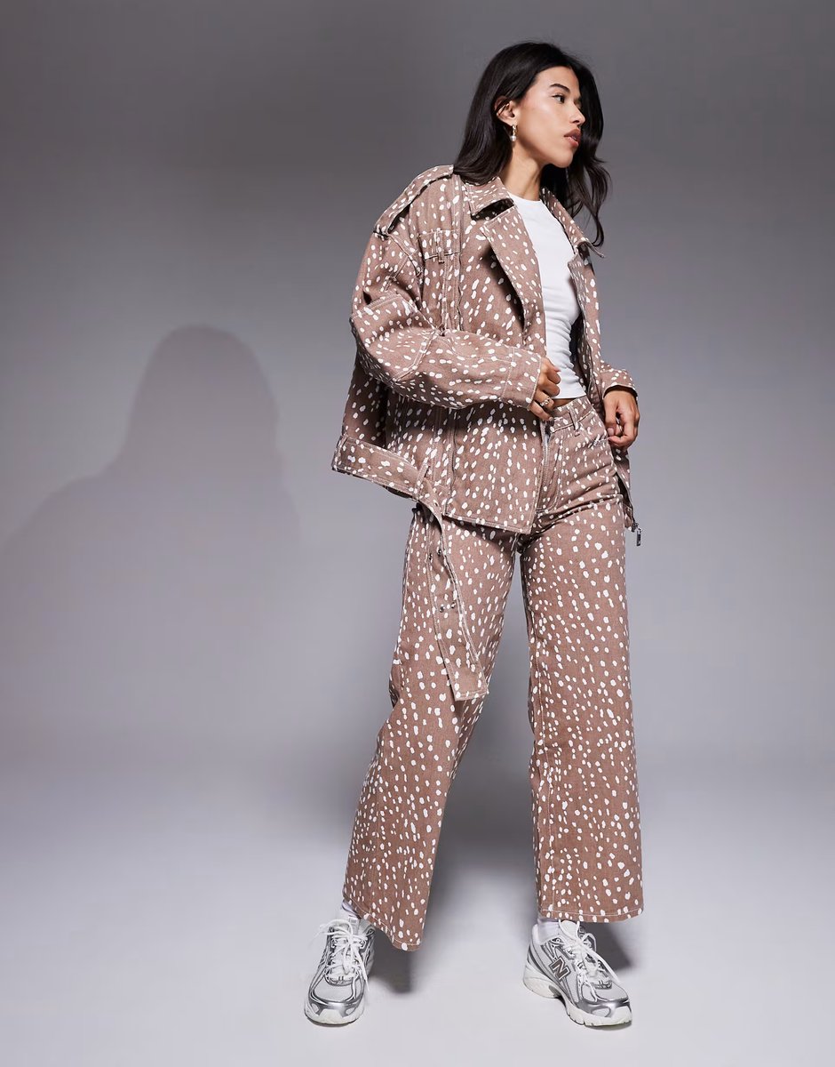 Brown Print Oversized Biker Jacket & Jean Co-ord — the must-have casual look for relaxed weekends or evening outings. Designed in brown print, this oversized biker jacket & jean co-ord set features a printed jacket with long sleeves and a drawstring waist, paired with matching printed pants for a cohesive look. Crafted from lightweight denim fabric for a comfortable fit. Perfect for casual occasions.