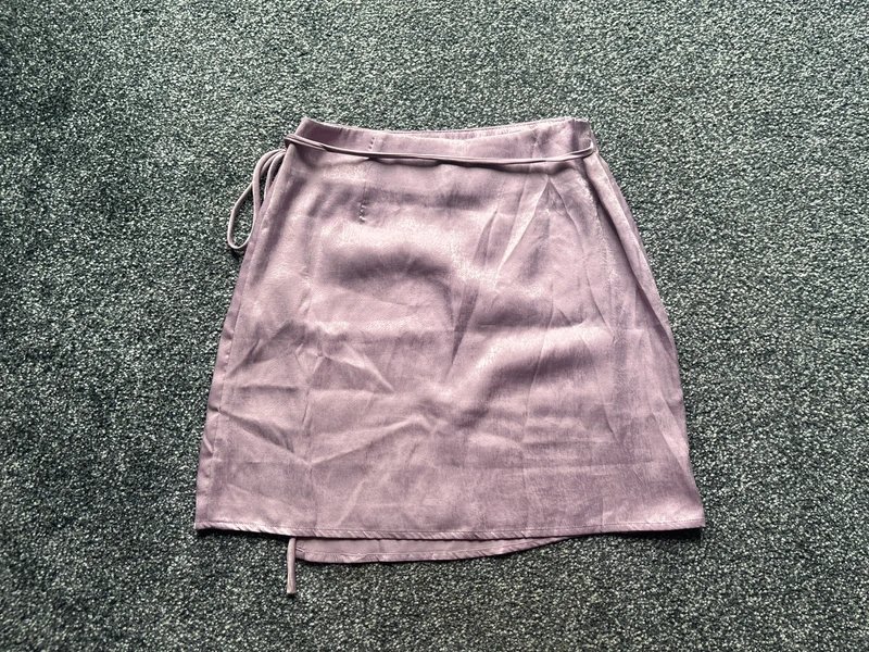 The ASOS Lilac Mauve Satin Wrap Mini Skirt is available in sizes S.