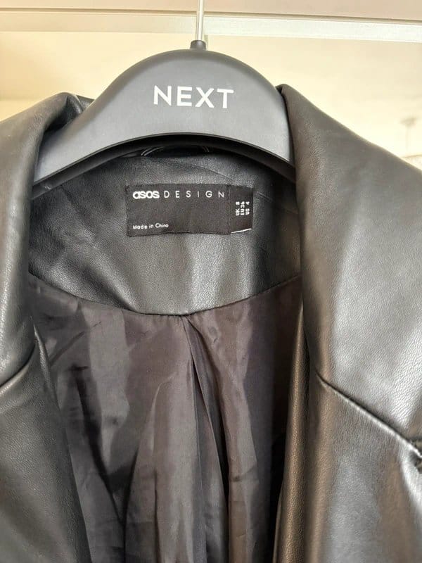 Sleek black leather long jacket from ASOS DESIGN. Features a classic lapel collar, zip front closure, and leather-like fabric for a modern edge. Perfect for layering over casual outfits.