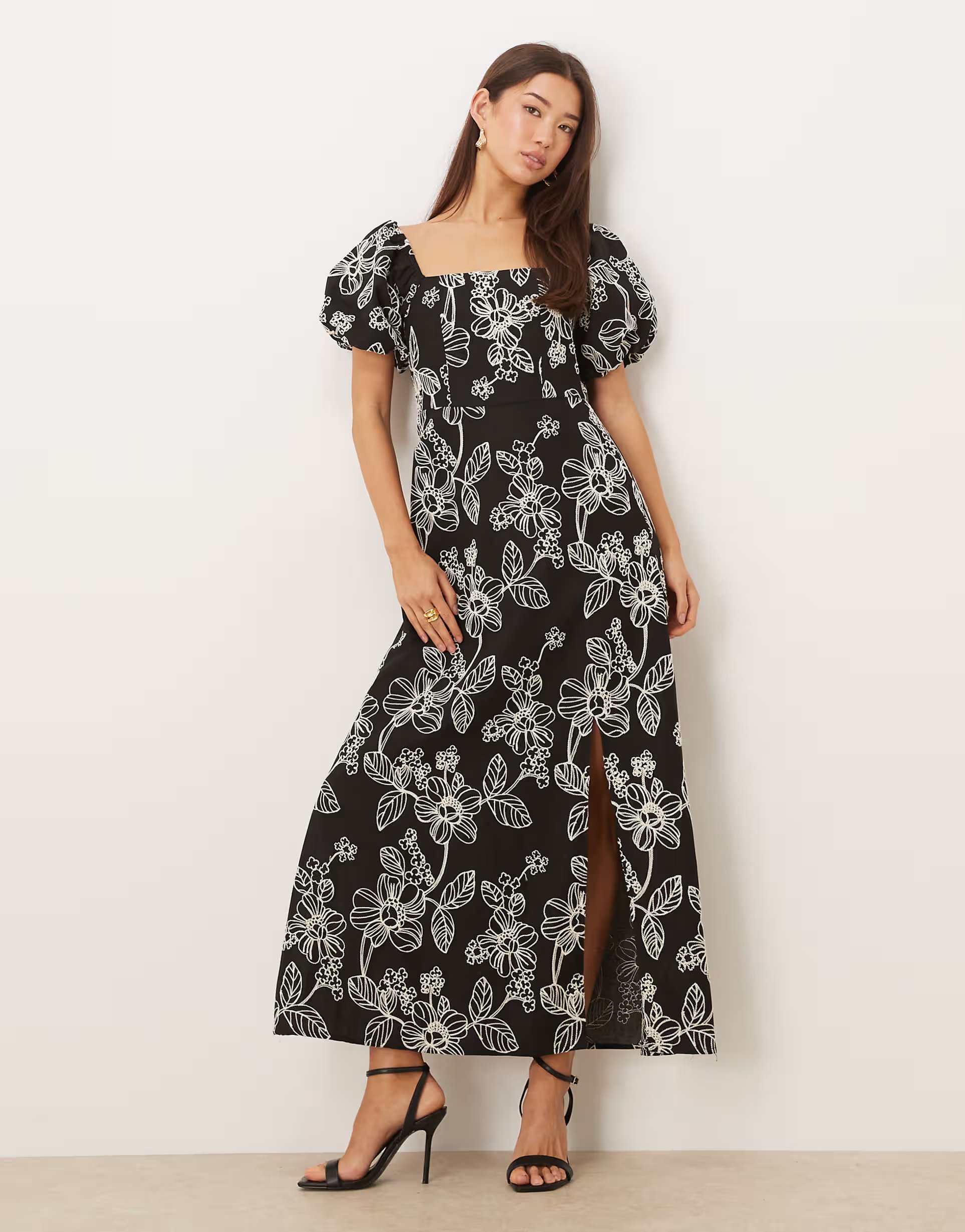 The ASOS Embroidered Short Sleeve Square Neck Midi Dress in Black is ideal for evening, casual, date-night.