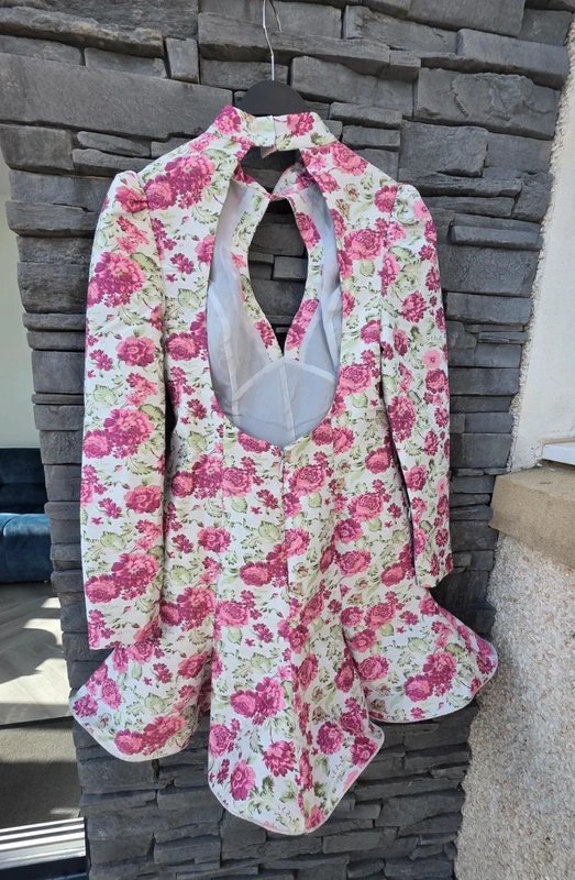 This stunning floral dress by Asos Luxe is perfect for special occasions. Designed in a beautiful floral print, this mini dress features a cut-out neckline and short sleeves. Crafted from lightweight fabric, it offers a flattering fit and a playful silhouette. Ideal for wedding guests, birthday parties, and day events.