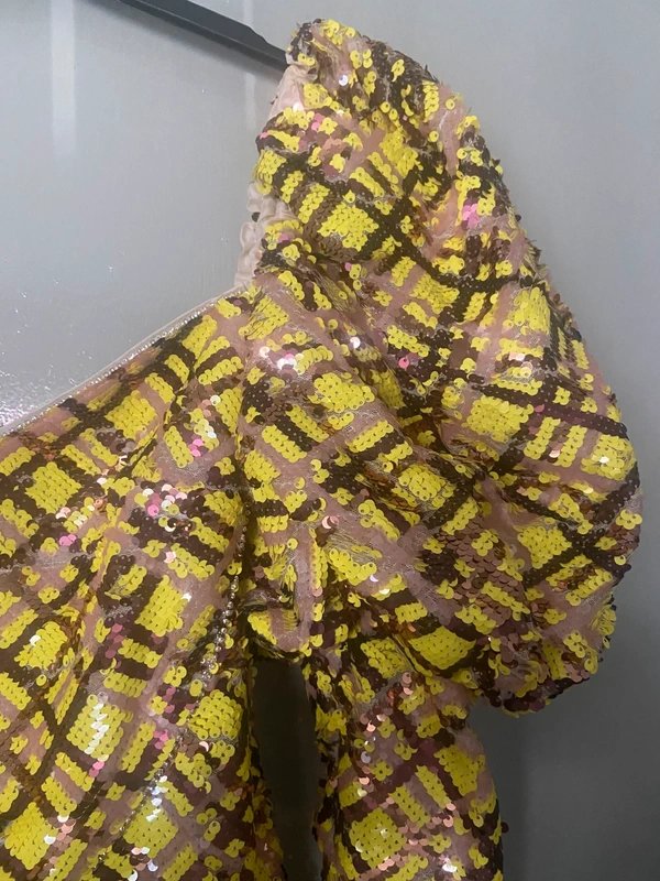 The ASOS Luxe Sequin Mini Dress with Puff Sleeve in Mustard is available in sizes M.