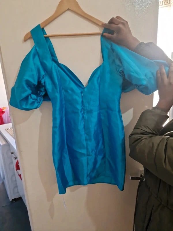This blue satin mini dress from Asos Luxe features a sheer off-the-shoulder neckline and puff sleeves. The sheer fabric adds a touch of elegance, making it perfect for evening events or special occasions.