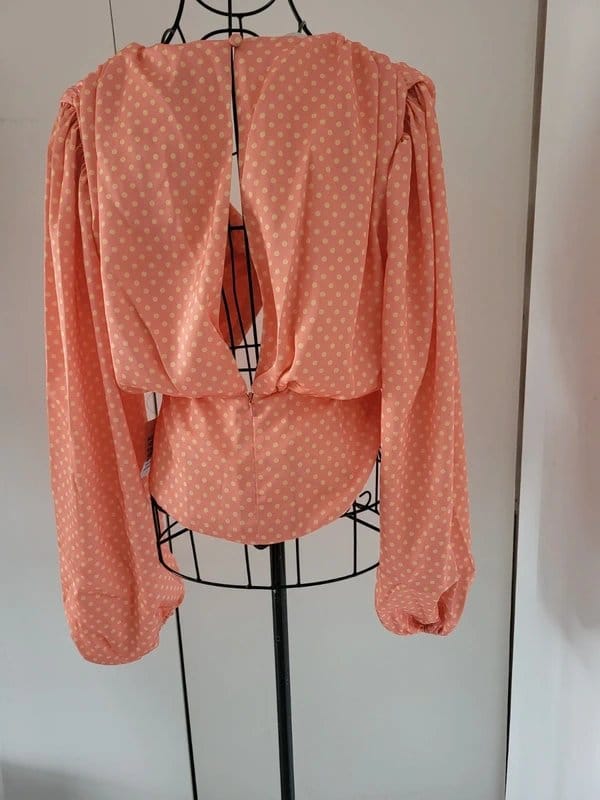 This Asos Luxe top features a polka dot pattern in vibrant orange and yellow. Made from satin fabric, it has a drape twist front and puff sleeves for a chic look. Ideal for casual outings or adding a pop of colour to your wardrobe.