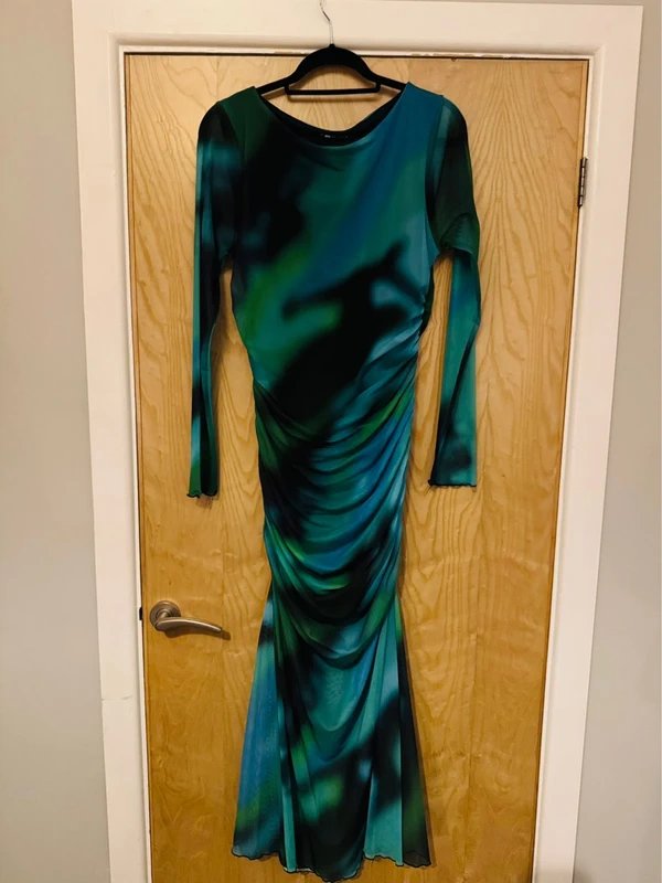 This elegant off-shoulder dress features a beautifully flowing silhouette with soft ruching that flatters the waist and drapes effortlessly over the body. The sheer, lightweight fabric moves gracefully with every step, while the rich blend of teal, emerald, and deep blue tones creates a striking, almost watercolor effect. Feminine, romantic, and effortlessly chic, it’s perfect for special occasions, evening events, holidays, or summer parties where you want to look elegant without trying too hard.
