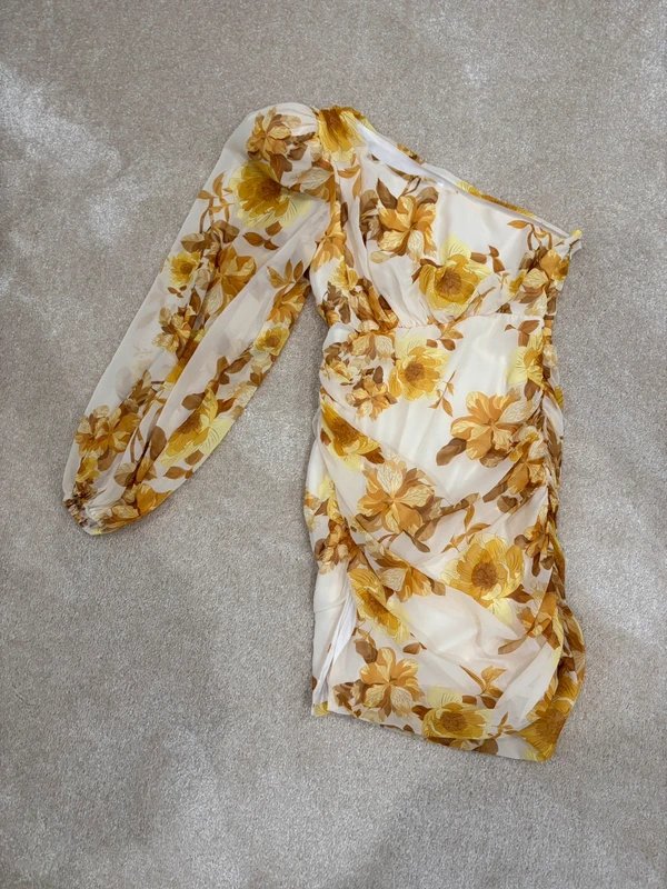 Designed in Mustard and Gold, this one-shoulder midi dress features a chiffon fabric with a floral print. Perfect for a spring wedding or formal event, it offers a romantic and elegant look.
