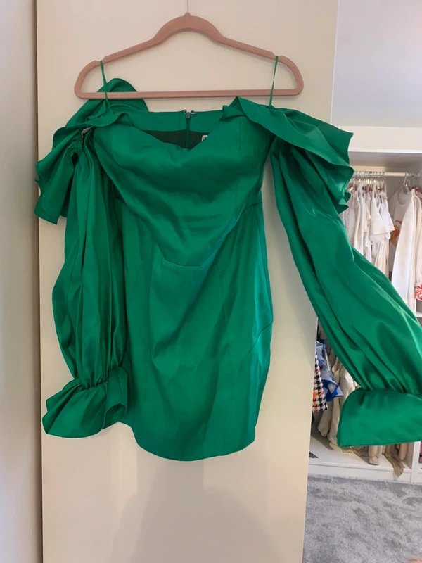 This offshoulder blouse features long sleeves made from silk fabric, perfect for a touch of elegance. Its green color adds a vibrant pop to any ensemble.