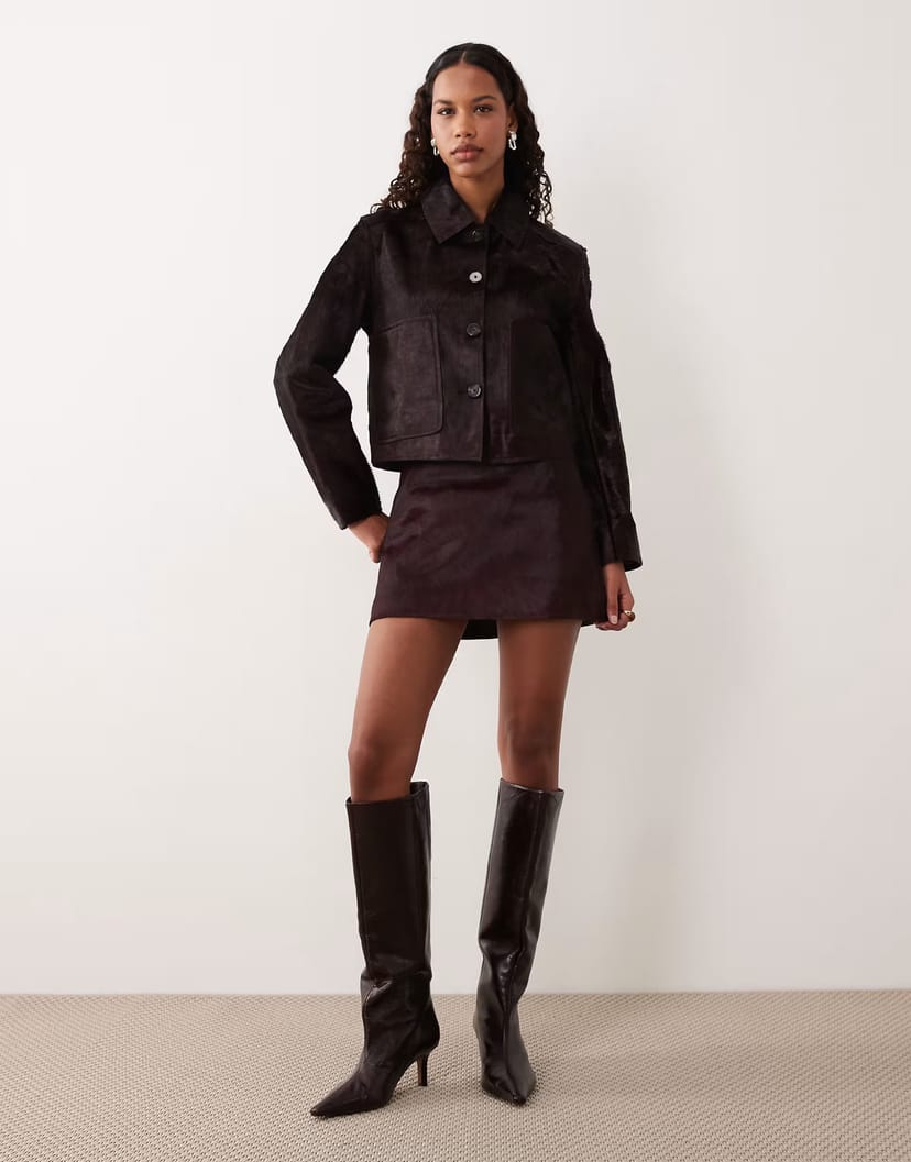 The ASOS Burgundy Leather Jacket & Mini Skirt Co-ord is made from leather.