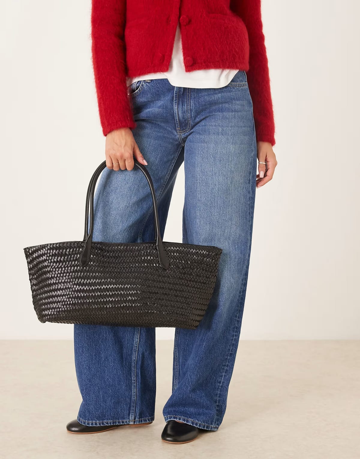 Stylish black leather large shopper bag from ASOS. Features a woven design and double handles for easy carrying. Perfect for everyday use or special occasions.