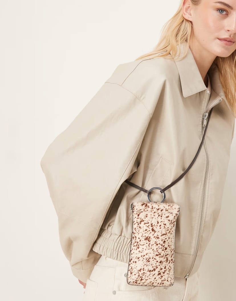 Stylish ASOS shoulder bag made from 100% leather with a cow print pattern. Features a leather strap with a metal ring for easy carrying. Perfect for everyday use.