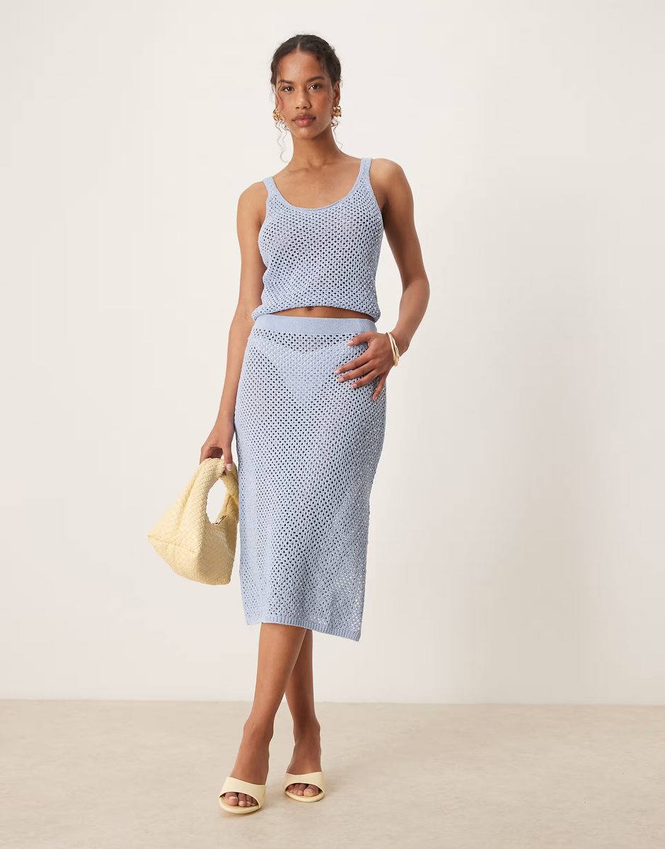 The ASOS Mango Crochet Midi Skirt Co-ord in Sky Blue is ideal for casual, smart-casual.
