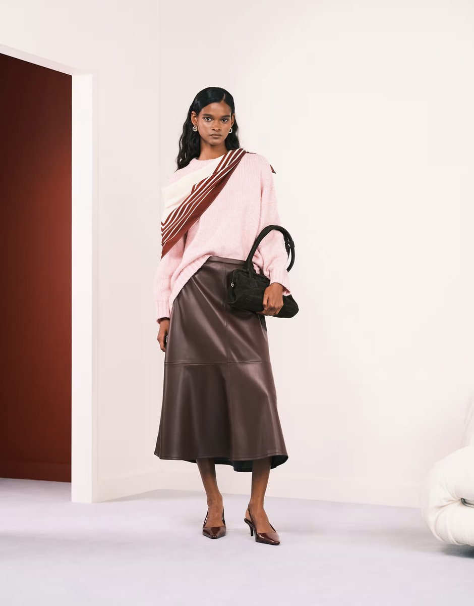 This burgundy faux leather midi skirt from ASOS is a statement piece, featuring a sleek silhouette that falls just below the knee. Perfect for adding a touch of edginess to any outfit.