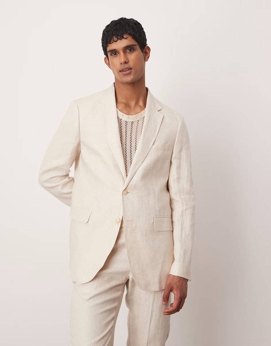 Crafted with light beige flax linen, this Mango blazer co-ord from ASOS offers a slim fit and a button closure. Perfect for a casual or business-casual look.