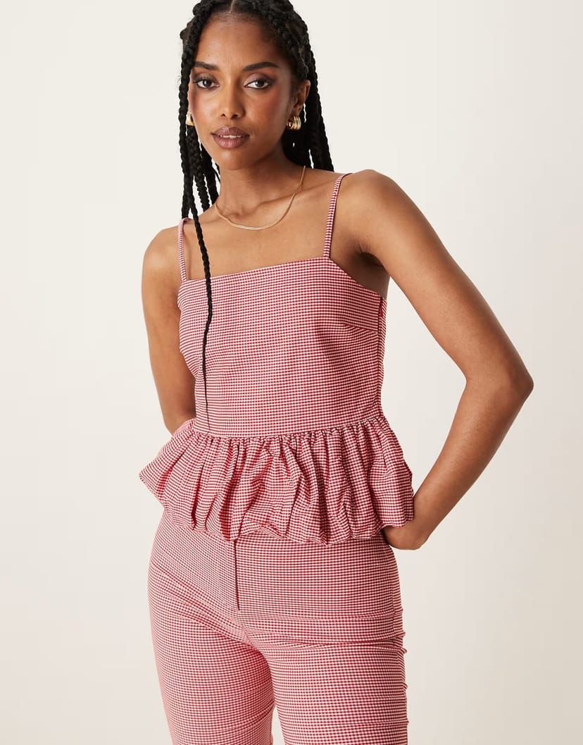 The ASOS Gingham Ruche Hem Cami Co-ord in Red is ideal for casual.