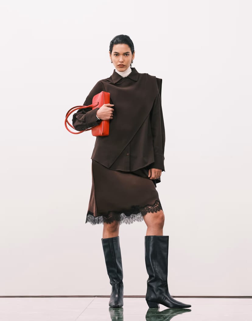 This knee-length skirt by ASOS features a rich brown colour and a delicate lace edge. The sheer fabric adds a touch of elegance, perfect for both casual and formal occasions.