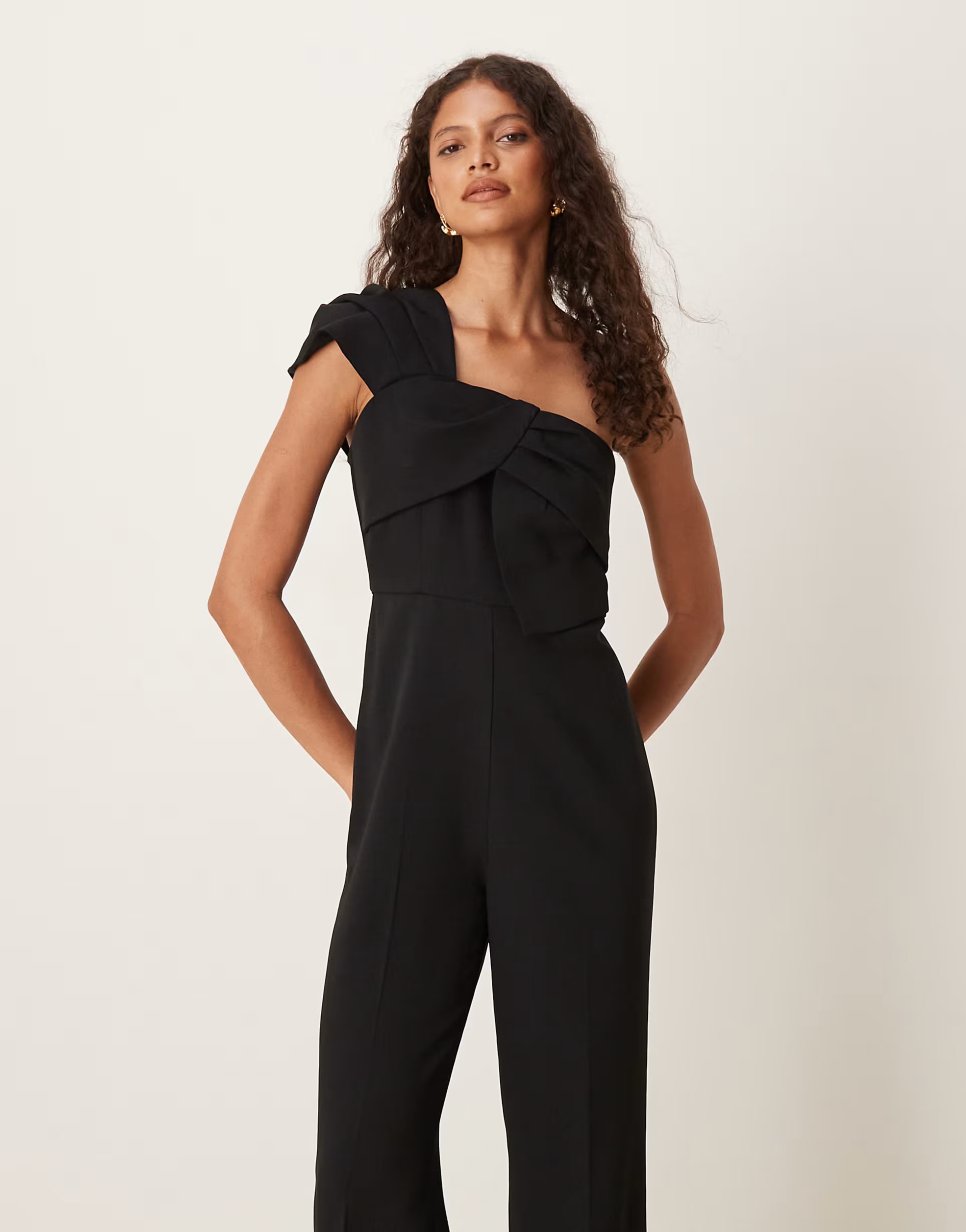 The ASOS Mango One Shoulder Bow Jumpsuit in Black is made from polyester, elastane.