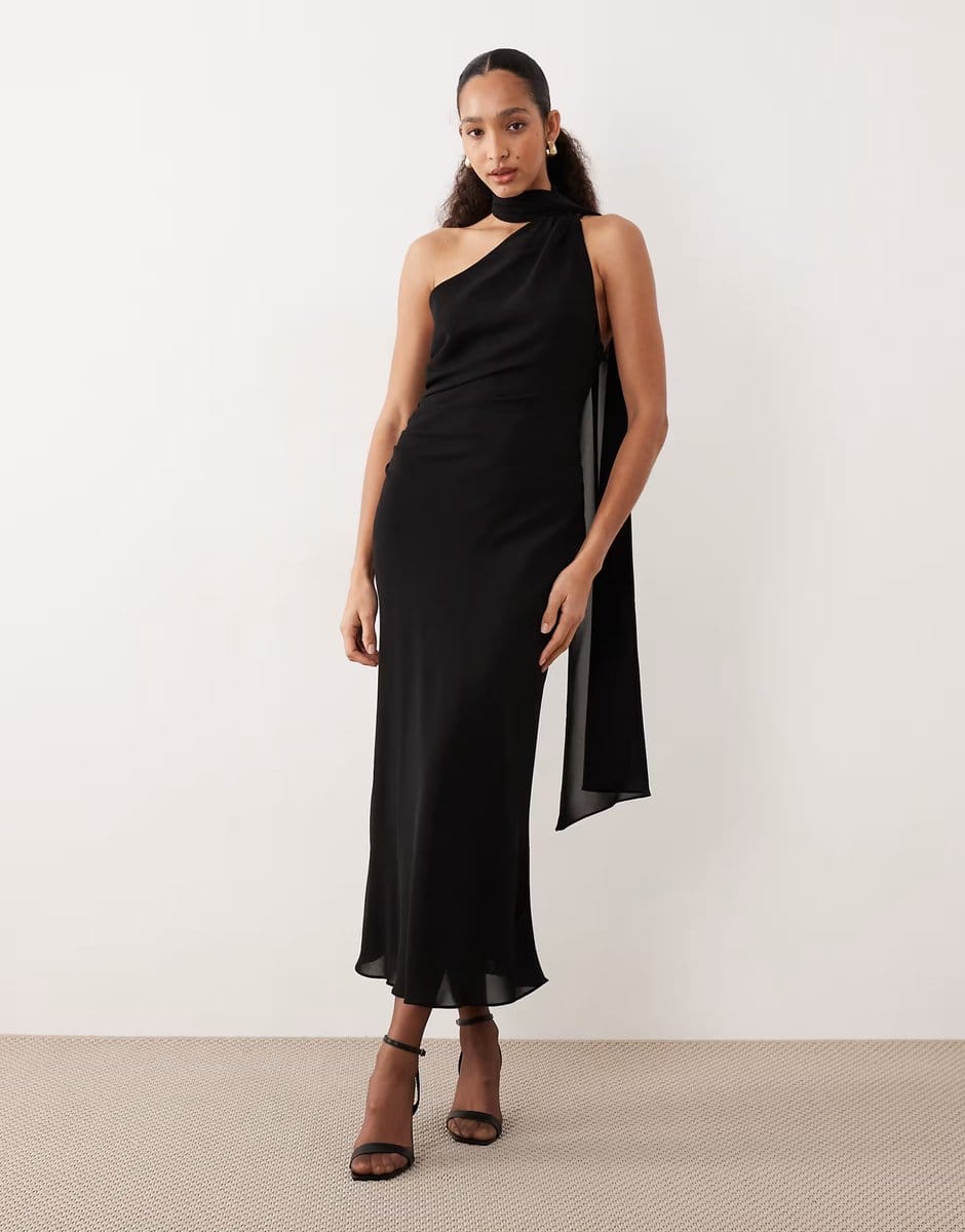 The ASOS One Shoulder Maxi Dress with Drape Detail in Black is ideal for evening, formal.
