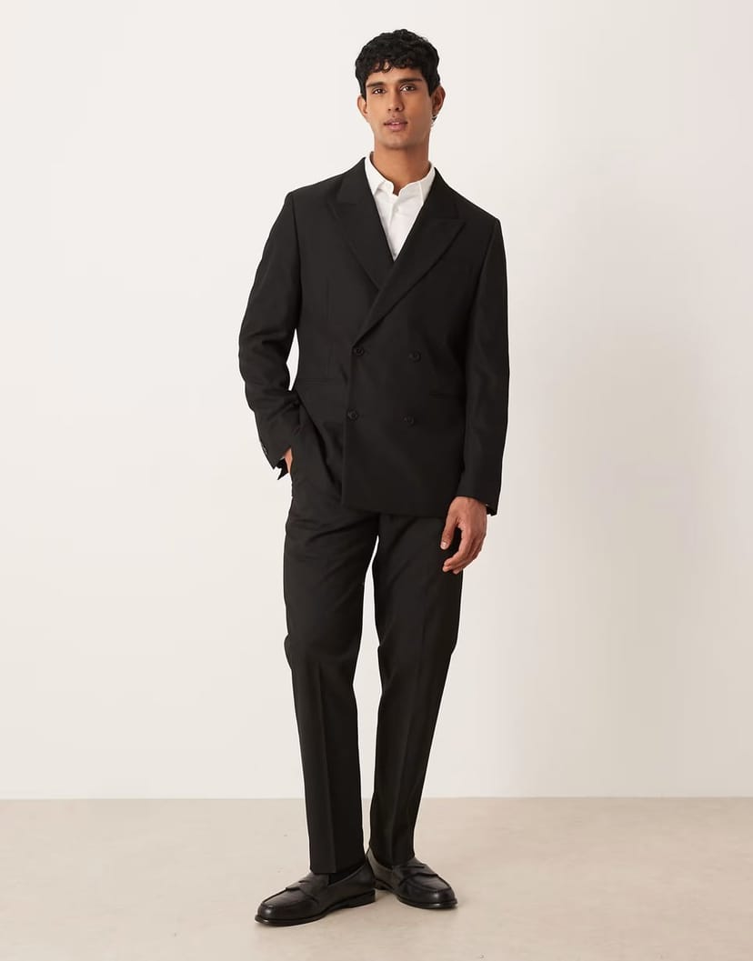 The ASOS Double-Breasted Blazer and Trousers in Black is ideal for work, business, formal.