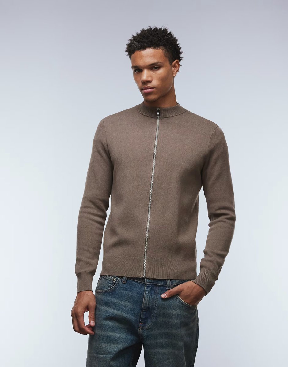 The ASOS Camel Round Neck Zip Through Knitted Cardigan is available in sizes XXXL, XXL, XL, XS, L, M, S.