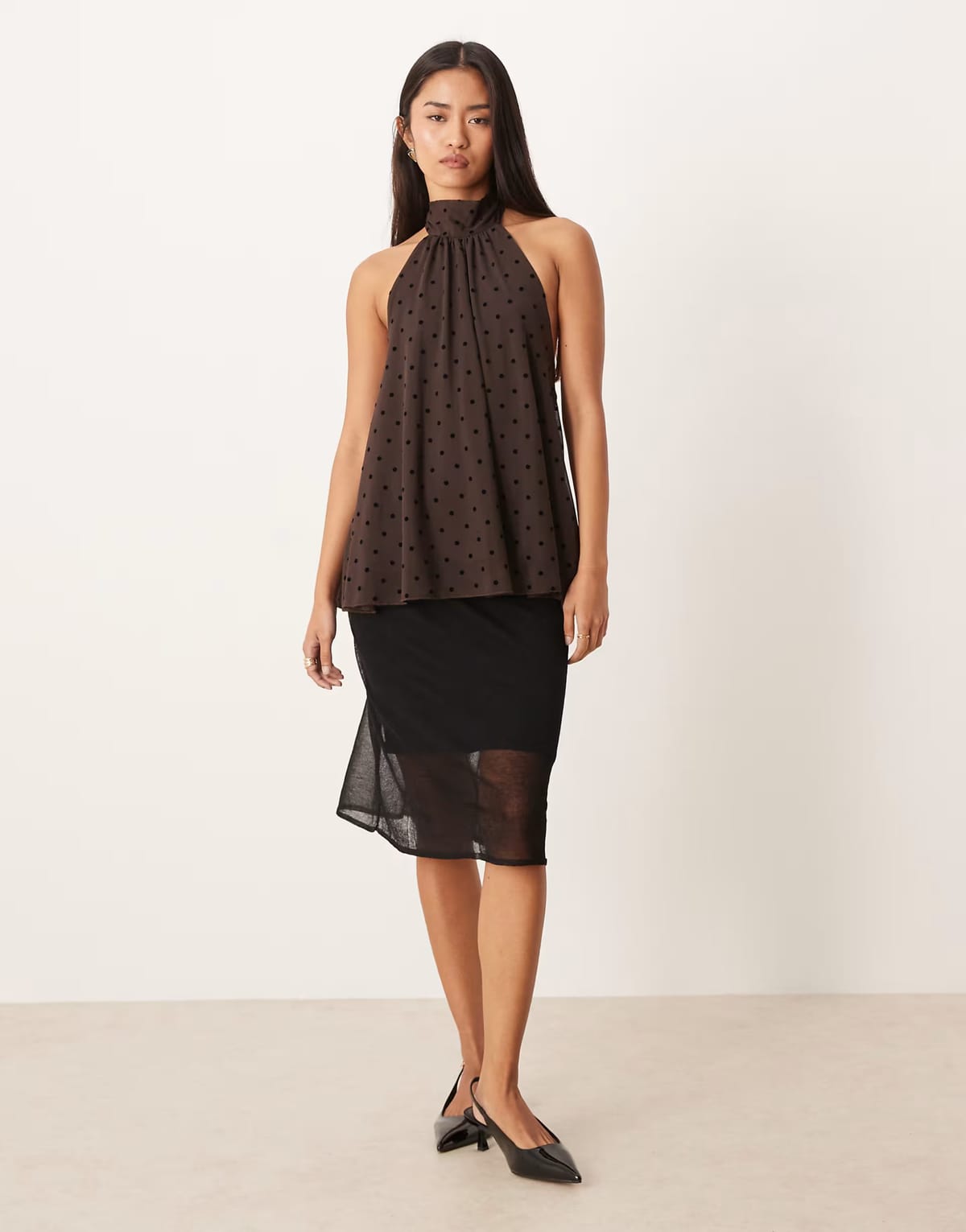 Chic brown polka dot blouse with a halter neckline and sheer black skirt with a slip. Perfect for a casual yet stylish look.