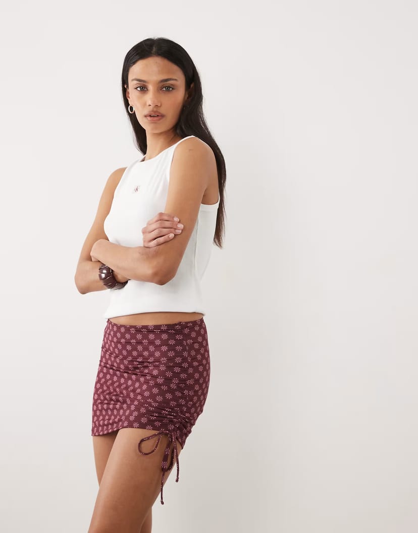 The ASOS Mango Teen Ruched Side Mini Skirt in Red Sunshine Print is ideal for casual, outings, daytime.