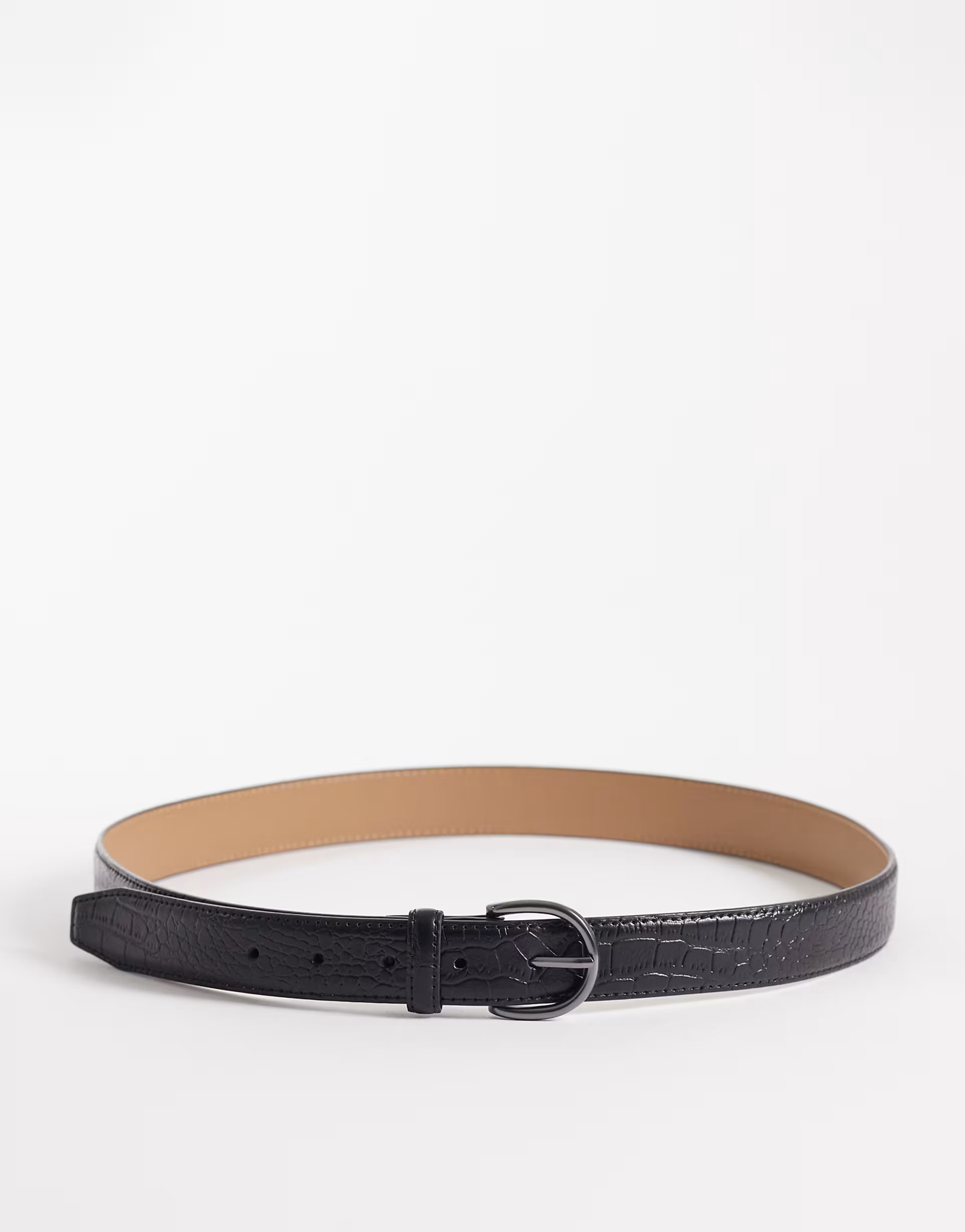 This black textured leather belt from ASOS is a sleek addition to any outfit. Designed with a textured leather finish, it offers a bold statement piece that can elevate both casual and formal looks.