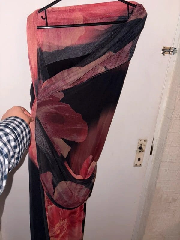 Beautifully designed with burgundy floral print, maxi length, off-shoulder neckline with a wrap detail, this dress is perfect for a glamorous evening out.