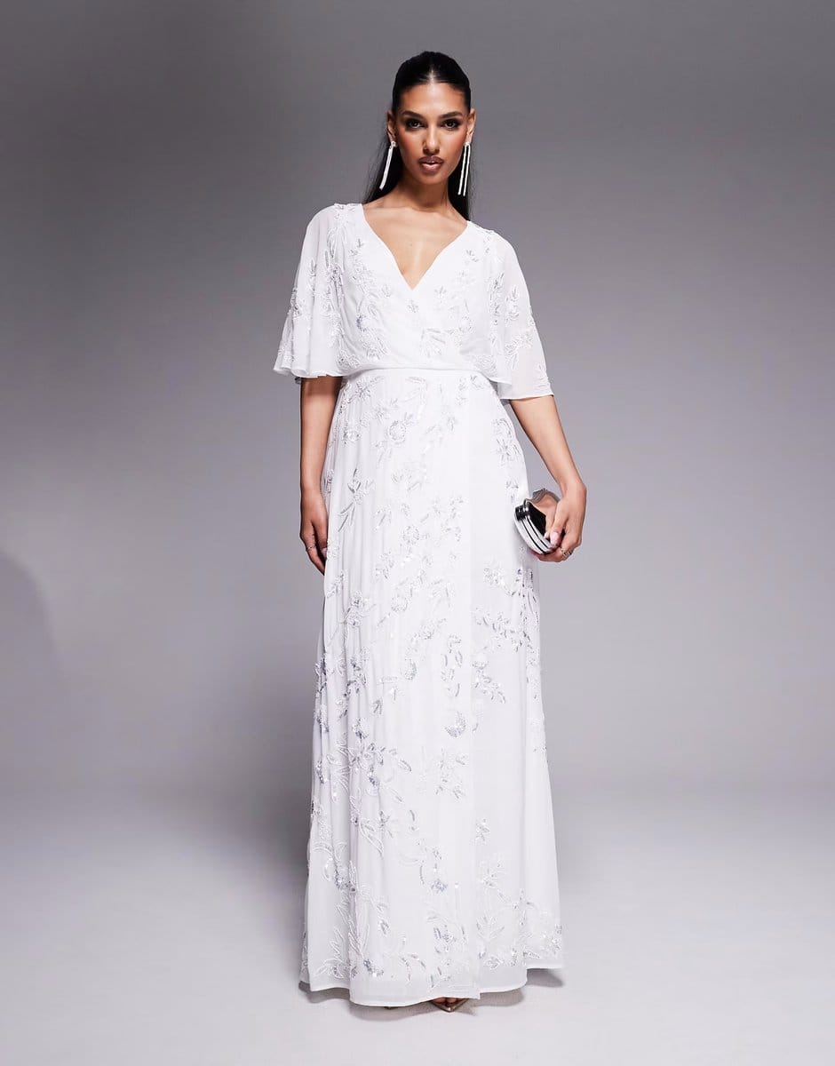 The ASOS Maya Bridal Floral Embellished Cape Sleeve Faux Wrap Maxi Dress in White is available in sizes XXXL, XXL, XL, XS, L, M, S.