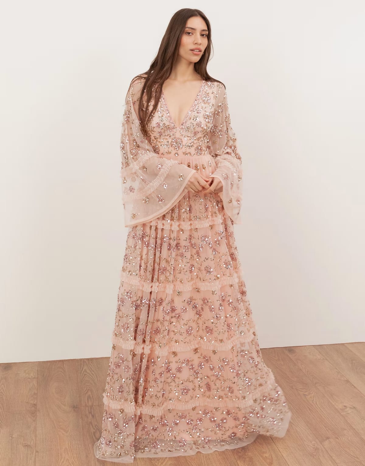 Elegant and embellished, this maxi dress features a flared silhouette in soft peach. Perfect for evening events or formal occasions, it exudes grace and charm.