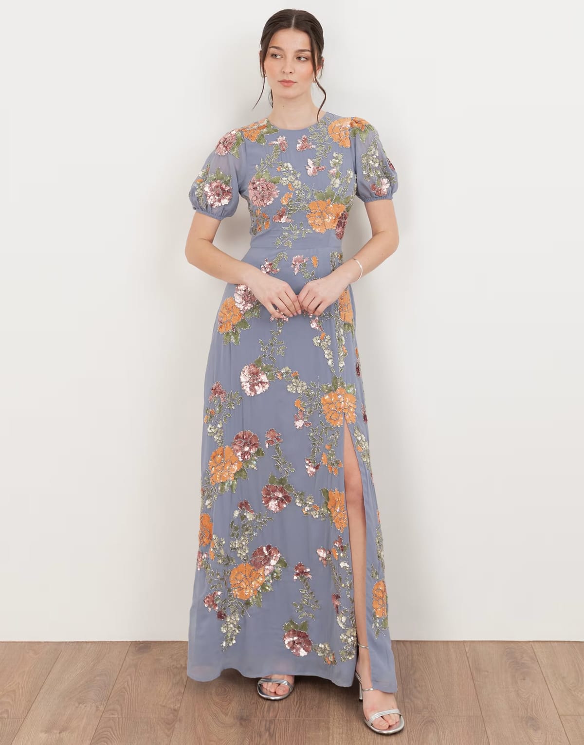 The ASOS Embellished Puff Sleeve Maxi Dress in Wisteria Blue is ideal for evening, party.