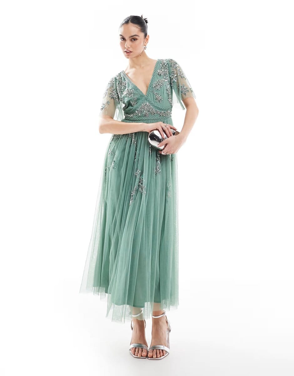 The ASOS Embellished Short Sleeve Midi Dress in Dark Sage is ideal for evening, special occasion, formal.