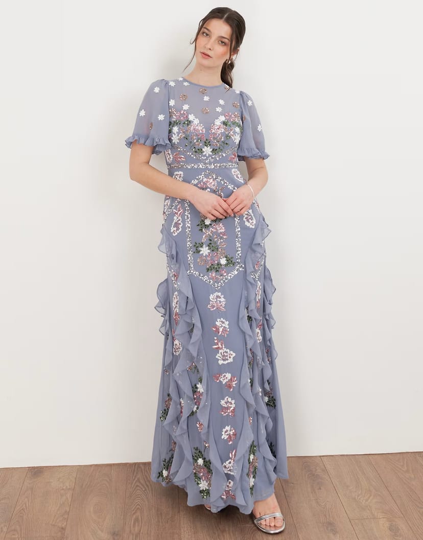 The ASOS Embroidered Short Sleeve Ruffled Maxi Dress in Wisteria Blue is ideal for evening, formal.