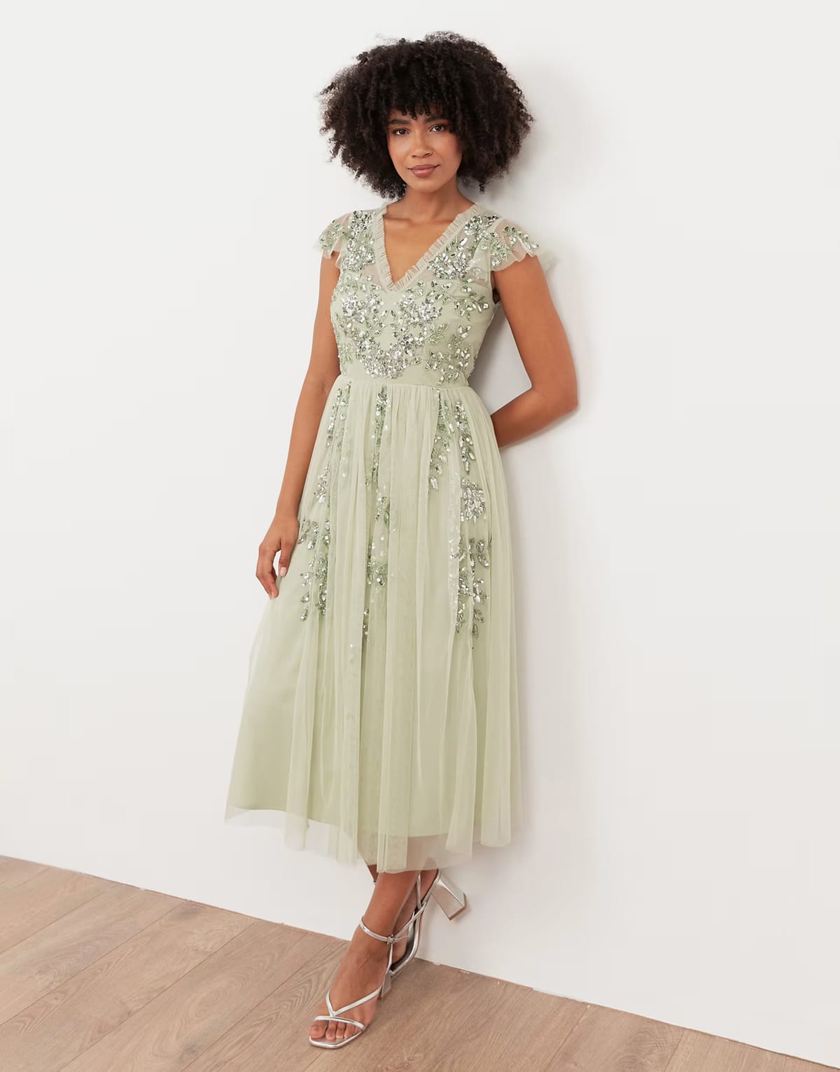The ASOS Embellished Tulle Midi Dress in Meadow Green is ideal for evening, special occasion.