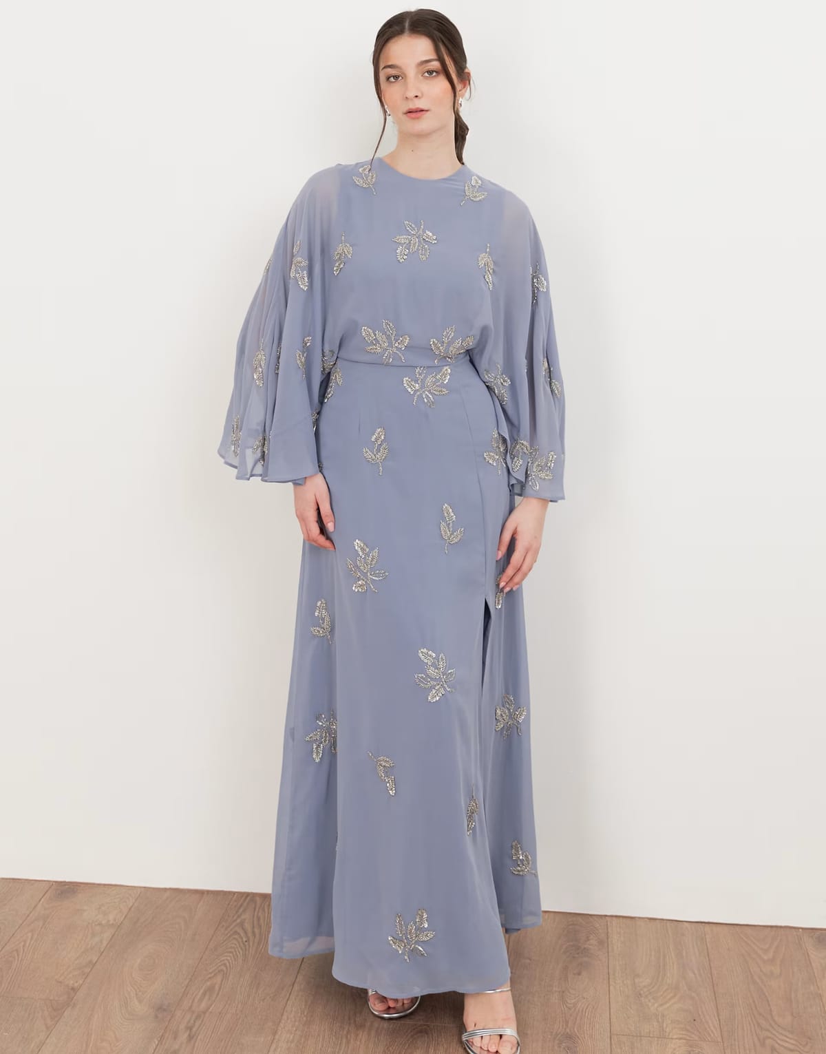 The ASOS Floral Embellished Cape Sleeve Maxi Dress in Wisteria Blue is available in sizes XXXL, XXL, XL, XS, L, M, S.