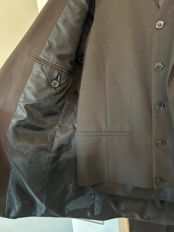 This brown suit jacket and waistcoat set from ASOS is perfect for formal events like races and weddings. The jacket features a classic three-button front, welt pockets, and flap pockets with button closures. The waistcoat complements the jacket with a matching three-button front and flap pockets.