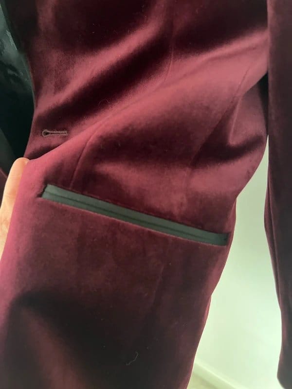 Stylish burgundy velvet blazer from ASOS. Features satin lapels and a skull pin. Ideal for weddings, parties, or formal events.